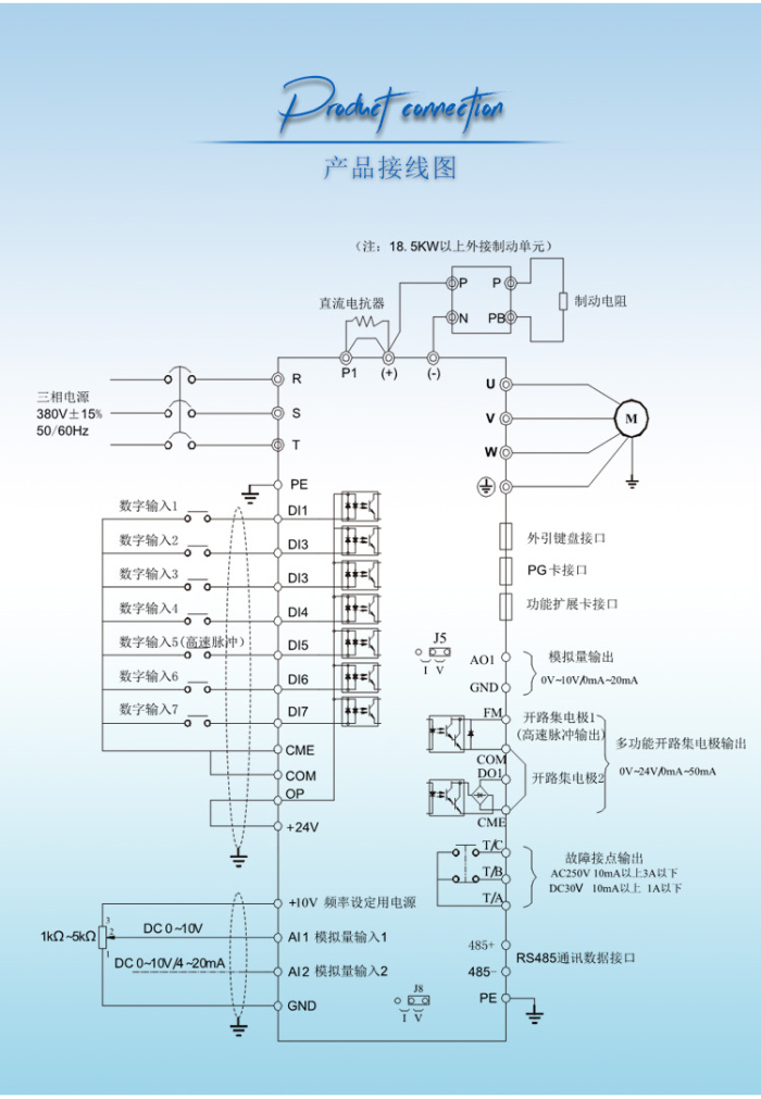 4.多種速度控制方式:模擬量輸入0-5VDC,0-10VDC,0/4-20mA;面板電位器調(diào)速(更改參數(shù)可設(shè)置上下按鍵調(diào)速);外接電位器調(diào)速;可通過(guò)485通訊調(diào)速。