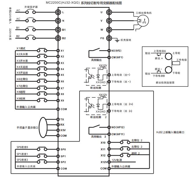 MC2200C /HJ32、MC3300/HJ33 線切割專用變頻器是我司針對線切割機床市場推出的一系列專用變頻器,集成了傳統(tǒng)通用變頻器功能+PLC(單片機控制)功能+外置手控盒功能;使用我司MC2200C/HJ32、MC3300/HJ33 系列線切割專用變頻器只需將外部信號直接接入相對應端口即可實現(xiàn)所有控制,與通用變頻器相比省去眾多不必要的參數(shù)設置,安裝接線使用更簡單方便。